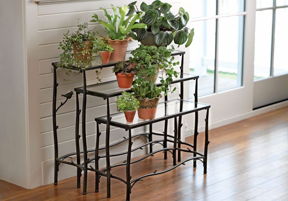 В наличии цветочницы из металла, цвет: черный с золотом. Под разное количество горшков – от 1 до 9. Различные дизайны. Также в продаже дровницы и наборы к камину.